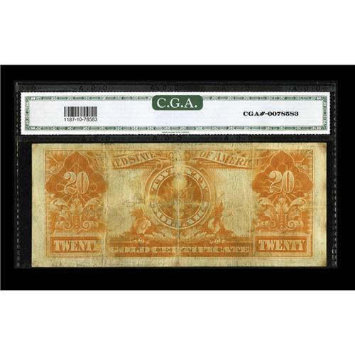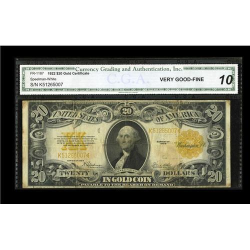 <B>Fr. 1187 $20 1922 Gold Certificate CGA Very Good-Fine 10.</B></I> This is a bright note for the grade, though it did spend quite a bit of time folded up.