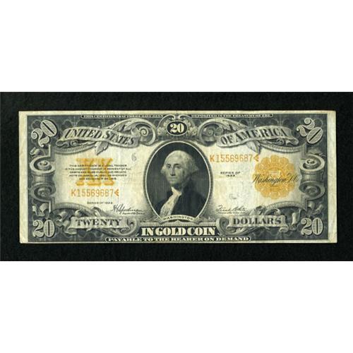<B>Fr. 1187 $20 1922 Gold Certificate Fine-Very Fine.</B></I> Nice color is still maintained by this gold note that is strongly margined.<BR><BR><b>Shipping:</b> Coins & Currency (<a target="_blank" href="http://www.heritageauctions.com/common/shipping.php">view shipping information</a>)