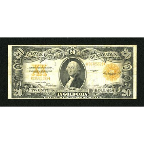 <B>Fr. 1187 $20 1922 Gold Certificate Fine++.</B></I> The colors are deep and bright on this note from a very popular issue.<BR><I>From The Warren Marshall Collection</B></I><BR><BR><b>Shipping:</b> Coins & Currency (<a target="_blank" href="http://www.heritageauctions.com/common/shipping.php">view shipping information</a>)