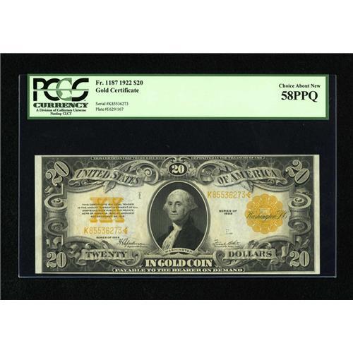 <B>Fr. 1187 $20 1922 Gold Certificate PCGS Choice About New 58PPQ.</B></I> Plenty of embossing can be spotted within the encapsulation of this bright representative for type.<BR><BR><b>Shipping:</b> Coin/Currency (<a target="_blank" href="http://www.heritageauctions.com/common/shipping.php">view shipping information</a>)
