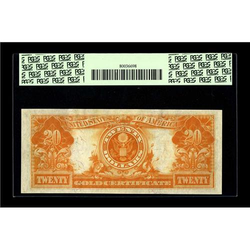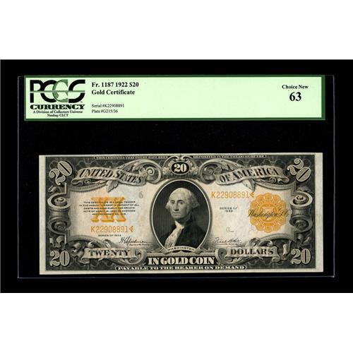 <B>Fr. 1187 $20 1922 Gold Certificate PCGS Choice New 63.</B></I> A beautifully colored example of the final Gold Certificate $20 type.<BR><I>From The Bill and Kathy Stella Currency Collection</B></I><BR><BR><b>Shipping:</b> Coin/Currency (<a target="_blank" href="http://www.heritageauctions.com/common/shipping.php">view shipping information</a>)