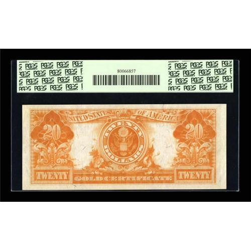 <B>Fr. 1187 $20 1922 Gold Certificate PCGS Choice New 63PPQ.</B></I> A bright and very colorful piece which could easily have made the full Gem grade had the face margins been just a bit more broad. The originality of this note can easily be discerned through the PCGS holder, as can the embossing. <BR><BR><b>Shipping:</b> Coins & Currency (<a target="_blank" href="http://www.heritageauctions.com/common/shipping.php">view shipping information</a>)