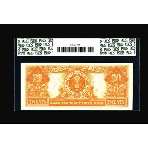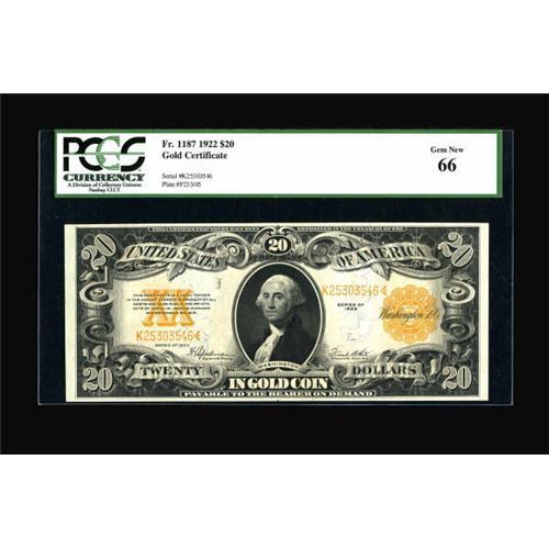 <B>Fr. 1187 $20 1922 Gold Certificate PCGS Gem New 66.</B></I> Extremely bright colors on both sides highlight this well-margined late date Gold Certificate. PCGS population figures have not yet been released, but we would be very surprised if there were more than a few 66s of this number. It is often seen Uncirculated, but very rarely with good margins and bright colors. <BR><BR><b>Shipping:</b> Coins & Currency (<a target="_blank" href="http://www.heritageauctions.com/common/shipping.php">view shipping information</a>)