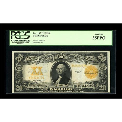 <B>Fr. 1187 $20 1922 Gold Certificate PCGS Very Fine 35PPQ.</B></I> A clean and bright example with a touch of tightness along the bottom margin.<BR><BR><b>Shipping:</b> Coins & Currency (<a target="_blank" href="http://www.heritageauctions.com/common/shipping.php">view shipping information</a>)