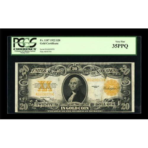 <B>Fr. 1187 $20 1922 Gold Certificate PCGS Very Fine 35PPQ.</B></I> This piece is exceptionally bright and colorful with a few too many folds for the next grade.<BR><BR><b>Shipping:</b> Coins & Currency (<a target="_blank" href="http://www.heritageauctions.com/common/shipping.php">view shipping information</a>)