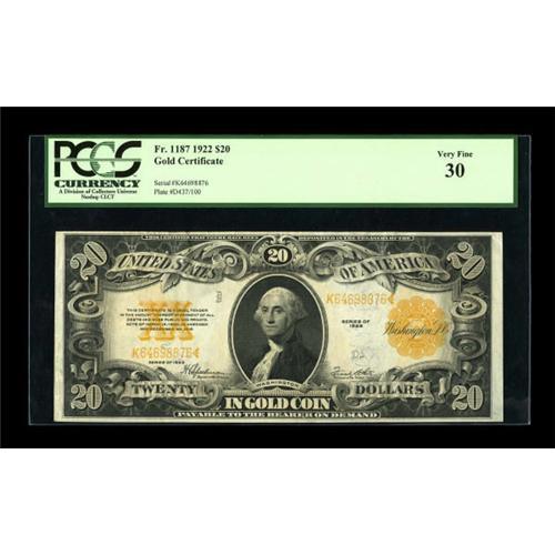 <B>Fr. 1187 $20 1922 Gold Certificate PCGS Very Fine 30.</B></I> A nicely centered example with plenty of eye appeal held from a higher grade due to a little softness along the top margin.<BR><BR><b>Shipping:</b> Coins & Currency (<a target="_blank" href="http://www.heritageauctions.com/common/shipping.php">view shipping information</a>)