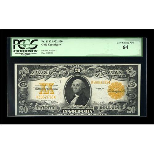 <B>Fr. 1187 $20 1922 Gold Certificate PCGS Very Choice New 64.</B></I> Bright inks are dazzling on this nicely margined note. Gem save for a tight margin along the bottom.<BR><BR><b>Shipping:</b> Coins & Currency (<a target="_blank" href="http://www.heritageauctions.com/common/shipping.php">view shipping information</a>)