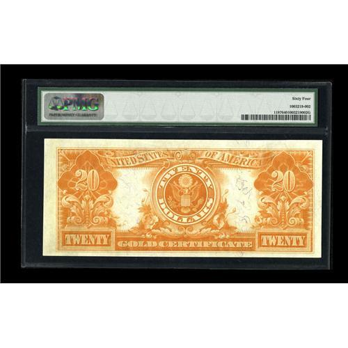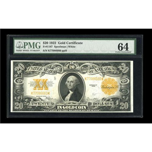 <B>Fr. 1187 $20 1922 Gold Certificate PMG Choice Uncirculated 64.</B></I> Very nicely margined example of this final $20 Gold Certificate. The colors are also quite strong.