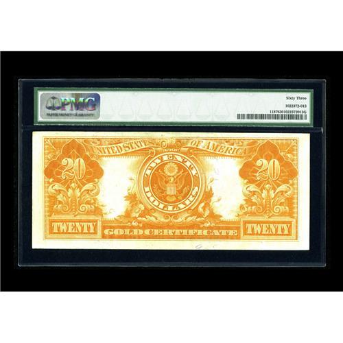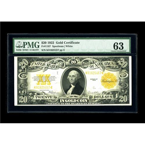 <B>Fr. 1187 $20 1922 Gold Certificate PMG Choice Uncirculated 63.</B></I> Bright colors are seen on this example that shows how difficult the cutting procedure for Large Size notes. There was not much space between the notes. A portion of the frameline of the note below is visible along the bottom margin. Likely to achieve a stong bid.<BR><I>From The Collection of Daniel Weissman</B></I><BR><BR><b>Shipping:</b> Coin/Currency (<a target="_blank" href="http://www.heritageauctions.com/common/shipping.php">view shipping information</a>)