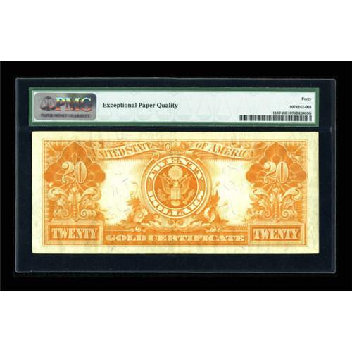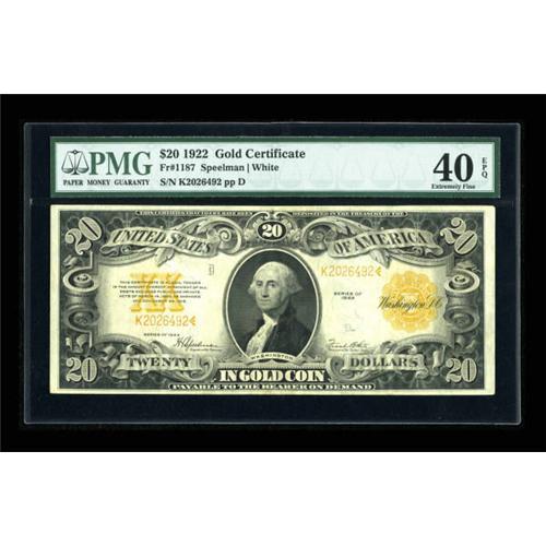 <B>Fr. 1187 $20 1922 Mule Gold Certificate PMG Extremely Fine 40 EPQ.</B></I> The few folds that account for the grade on this bright issue could better be described as bends.<BR><BR><b>Shipping:</b> Coins & Currency (<a target="_blank" href="http://www.heritageauctions.com/common/shipping.php">view shipping information</a>)