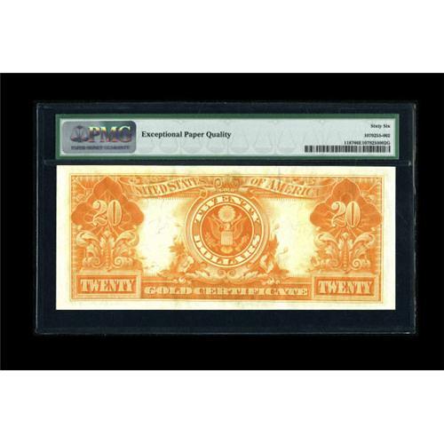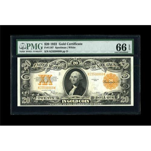 <B>Fr. 1187 $20 1922 Gold Certificate PMG Gem Uncirculated 66 EPQ.</B></I> PMG has graded 546 examples of this number--only seven of which grade higher than this 66 EPQ. This note is an absolute beauty with exceptional margins for the issue, deep original embossing, and spectacular color.<BR><BR><b>Shipping:</b> Coins & Currency (<a target="_blank" href="http://www.heritageauctions.com/common/shipping.php">view shipping information</a>)