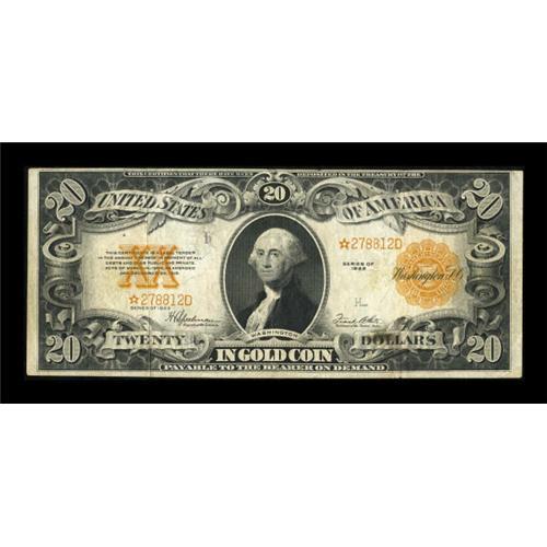 <B>Fr. 1187 $20 1922 Gold Certificate Star Note Very Fine.</B></I> A rather common Star Note, with over 130 examples known. This one is a solid VF, problem free save for a small dark area below Frank White's signature.<BR><BR><b>Shipping:</b> Coins & Currency (<a target="_blank" href="http://www.heritageauctions.com/common/shipping.php">view shipping information</a>)