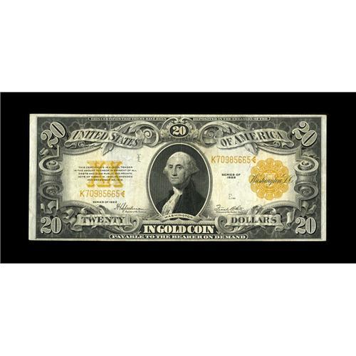 <B>Fr. 1187 $20 1922 Gold Certificate Very Fine.</B></I> A nicely margined and still quite crisp middle grade example of the strongly collected Gold Certificate series.<BR><BR><b>Shipping:</b> Coin/Currency (<a target="_blank" href="http://www.heritageauctions.com/common/shipping.php">view shipping information</a>)