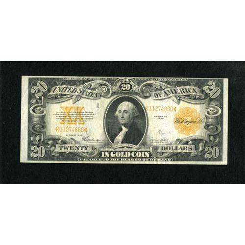 <B>Fr. 1187 $20 1922 Mule Gold Certificate Very Fine.</B></I> Crispy paper that is without pinholes define this $20 Gold with one lone margin nick.<BR><BR><b>Shipping:</b> Coins & Currency (<a target="_blank" href="http://www.heritageauctions.com/common/shipping.php">view shipping information</a>)