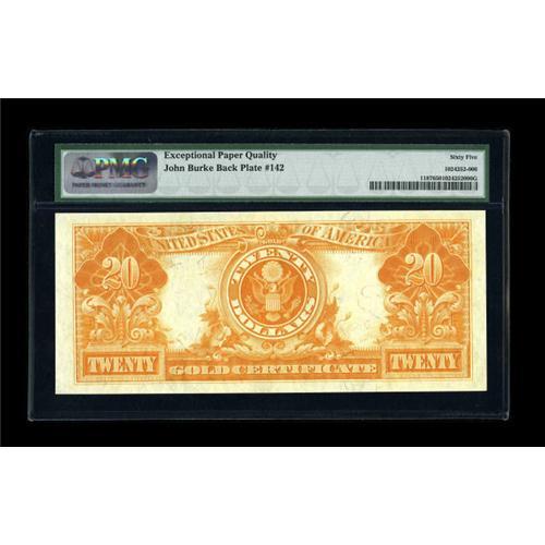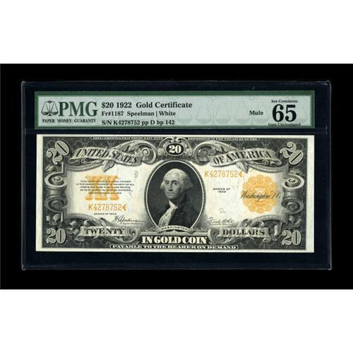 <B>Fr. 1187 $20 1922 Mule Gold Certificate PMG Gem Uncirculated 65 EPQ.</B></I> Other $20 Golds from this same serial number are known and all are CU. This piece is excellently margined with a sufficiently orange-yellow overprint and the paper waves are plainly visible in the holder.<BR><BR><b>Shipping:</b> Coin/Currency (<a target="_blank" href="http://www.heritageauctions.com/common/shipping.php">view shipping information</a>)