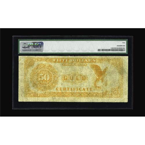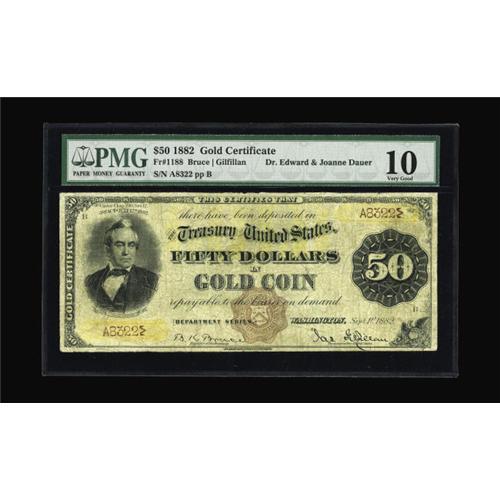 <B>Fr. 1188 $50 1882 Gold Certificate PMG Very Good 10.</B></I> Only eight examples of this number are known, all but one of which are right around this grade. The highest-grade note, an EF, sold for over $40,000 a few years ago. One of the eight known examples is permanently impounded, and opportunities to acquire any of the Fr. 1188's are few and far between. The note appears fully Fine from the face, with good color and decent margin size. The back is weaker, accounting for the assigned grade of VG. Silas Wright, who appears on the note, was a U.S. Senator from New York, and later Governor of New York. According to the Dauer book, which plates this note on page 338, "[Wright] was nominated as the Vice Presidential candidate in 1844, but turned it down so that he could run for Governor of New York. In that race, he defeated Millard Fillmore."<BR><I>From The Dr. Edward and Joanne Dauer Collection</B></I>