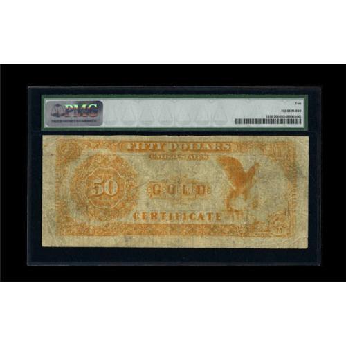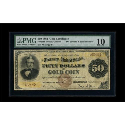 <B>Fr. 1188 $50 1882 Gold Certificate PMG Very Good 10.</B></I> This piece was part of the Dr. Edward and Joanne Dauer Gold Certificate offering in September of 2006, where it was described, "Only eight examples of this number are known, all but one of which are right around this grade. The highest-grade note, an EF, sold for over $40,000 a few years ago. One of the eight known examples is permanently impounded, and opportunities to acquire any of the Fr. 1188's are few and far between. The note appears fully Fine from the face, with good color and decent margin size. The back is weaker, accounting for the assigned grade of VG. Silas Wright, who appears on the note, was a U.S. Senator from New York, and later Governor of New York."<BR><BR><b>Shipping:</b> Coins & Currency (<a target="_blank" href="http://www.heritageauctions.com/common/shipping.php">view shipping information</a>)