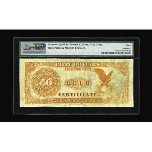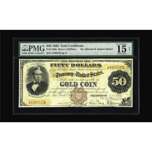<B>Fr. 1189a $50 1882 Triple Signature Gold Certificate PMG Fine 15.</B></I> Only eleven examples of this Friedberg number are known. There are two uncirculated pieces, one of which we sold in 1998 for over $80,000, and a second, the Bebee piece, which is in the ANA museum. This Dauer note, which is plated on page 338 of his book, serves as the Hessler illustration, and it was part of the Jim Thompson Collection. It sold at auction in 1990 for over $11,000. All Triple Signature notes are rare, with Fifty Dollar Gold Certificates being prohibitively so. The note bears the PMG comments, "Restoration & Margins Trimmed." The margins remain decent size, and the note has excellent color, and much of the appearance of a Very Fine piece. Anyone attempting to assemble a meaningful collection of Gold Certificates should consider the purchase of this note. It may be quite some time before any other Fr. 1189a makes its way to the market.<BR><I>From The Dr. Edward and Joanne Dauer Collection</B></I>