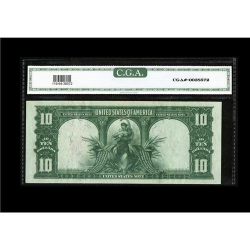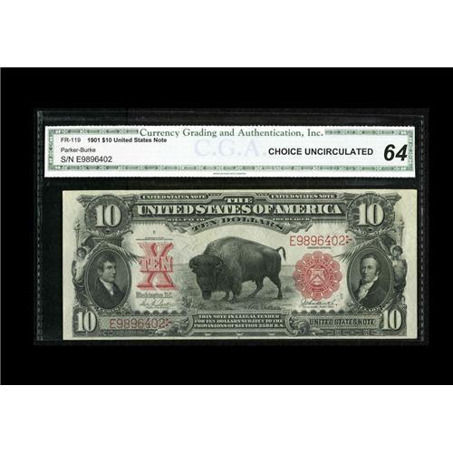 <B>Fr. 119 $10 1901 Legal Tender CGA Choice Uncirculated 64.</B></I> This lovely bison has excellent margins and incredibly flashy, bright colors. It is one of the lesser available Friedberg numbers for the type.<BR><I>From The Ron W. Keeney Collection</B></I>