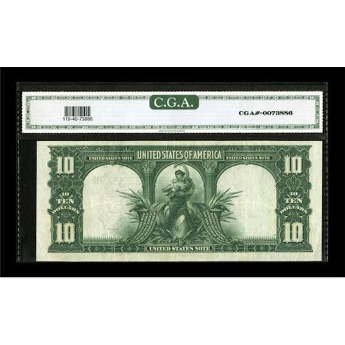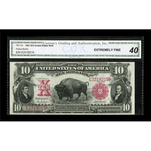 <B>Fr. 119 $10 1901 Legal Tender CGA Extremely Fine 40.</B></I> Though the number of folds is commensurate with a VF grade, they are tightly clustered and best defined as light bends giving the note an overall EF appearance.<BR><BR><b>Shipping:</b> Coins & Currency (<a target="_blank" href="http://www.heritageauctions.com/common/shipping.php">view shipping information</a>)