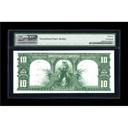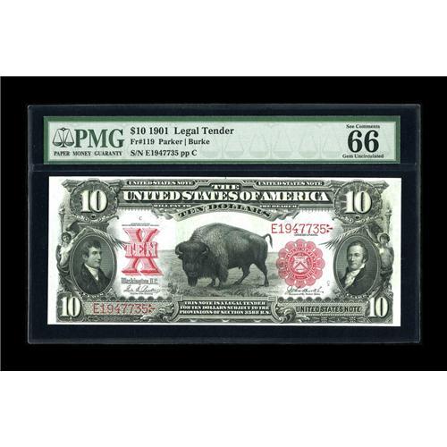 <B>Fr. 119 $10 1901 Legal Tender PMG Gem Uncirculated 66 EPQ.</B></I> Aesthetically, the cherry red seal, bright paper and deeply printed devices complement each other. The margins are nearly identical and if a touch more even at lower left, this may have been Superb.<BR><BR><b>Shipping:</b> Coin/Currency (<a target="_blank" href="http://www.heritageauctions.com/common/shipping.php">view shipping information</a>)