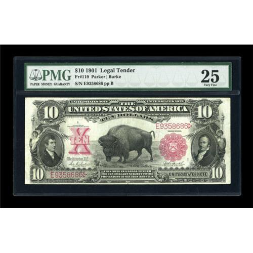 <B>Fr. 119 $10 1901 Legal Tender PMG Very Fine 25.</B></I> Fully intact paper and boldly printed Bison vignette are noted on this moderately circulated Legal Tender.<BR><BR><b>Shipping:</b> Coins & Currency (<a target="_blank" href="http://www.heritageauctions.com/common/shipping.php">view shipping information</a>)