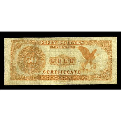 <B>Fr. 1190 $50 1882 Gold Certificate Fine.</B></I> Only five Fr. 1190s are known to exist, one of which is permanently impounded in the Federal Reserve Bank of San Francisco. Of the known notes, the highest grade example is an Extra Fine, which we sold in January of 1999 for $18,700. The other four pieces all grade Very Good or Fine. This note has some extremely minor, consummately well-done restorations at the outer edges, but it is free from internal problems. Needless to say, Fr. 1190 is a prohibitively difficult note to obtain in any grade. When we last sold this piece in May 2000, it brought $13,200. In today's much stronger market, we expect this piece to easily realize. . .<BR><BR><b>Shipping:</b> Coin/Currency (<a target="_blank" href="http://www.heritageauctions.com/common/shipping.php">view shipping information</a>)