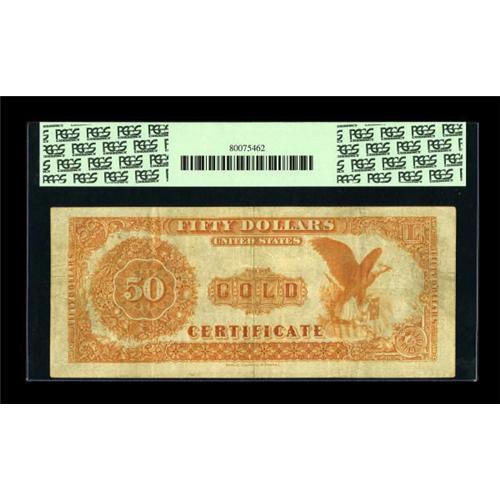 <B>Fr. 1192 $50 1882 Gold Certificate PCGS Very Fine 30PPQ.</B></I> One of only nineteen examples known of this Friedberg number, and to our best knowledge, the third finest example known. Two other VFs have been auctioned recently--a PMG 30, which we sold last September for $74,750, and a PMG 25, which sold this February for $63,250. This note is superior to both of those pieces. It's wonderfully centered with flashy, bright ink color. The back has retained its full bright orange, which is most unusual for circulated Gold Certificates of this era. A classic rarity both for design type and Friedberg number, and one of the few truly rare lightly circulated notes that is 100% free of damage, problems, or restorations of any kind. We would not be at all surprised to see this note enter six figure territory. <BR><BR><b>Shipping:</b> Coins & Currency (<a target="_blank" href="http://www.heritageauctions.com/common/shipping.php">view shipping information</a>)