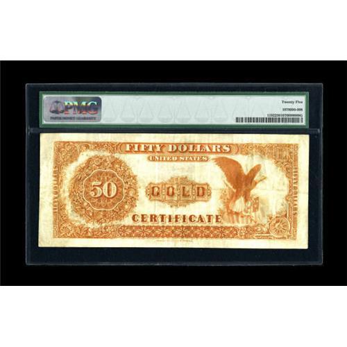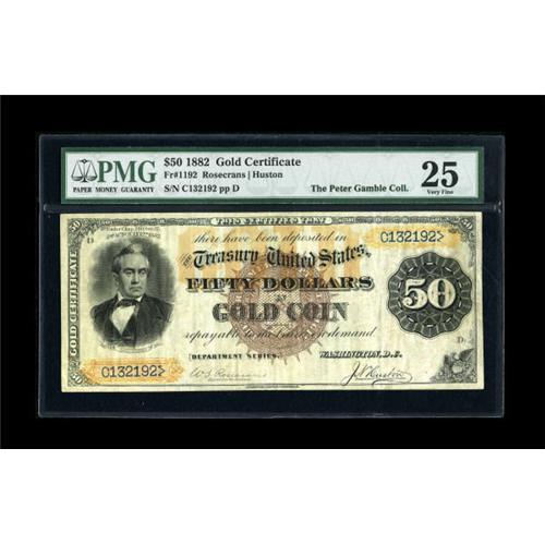 <B>Fr. 1192 $50 1882 Gold Certificate PMG Very Fine 25.</B></I> This brilliantly colored large brown seal $50 Gold Note is one of less than a dozen and a half examples of this number. It is rather high up in the census with only three or four circulated examples above it. No Fr. 1192s grading higher than XF are known. This one is a real beauty with broad margins, extremely bright colors, original paper surfaces, and not a hint of a defect. A PMG 45 sold for over $100,000 at last year's Memphis auction. While this note has more circulation, from the sheer point of eye appeal, it is not far behind that piece. We would not be at all surprised to see it pass the $74,000 figure that we attained in September 2006 for the Dauer PMG 30.<BR><I>From The Peter Gamble Collection.</B></I><BR><BR><b>Shipping:</b> Coins & Currency (<a target="_blank" href="http://www.heritageauctions.com/common/shipping.php">view shipping information</a>)