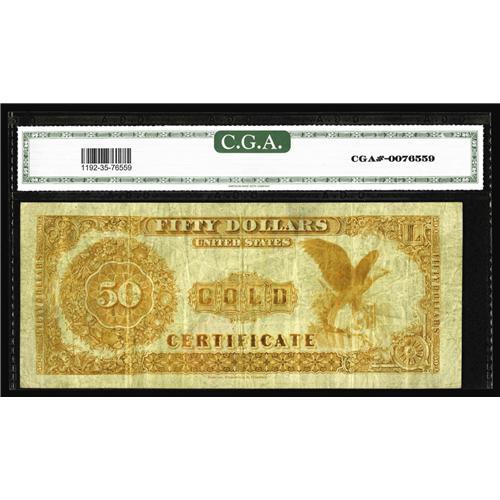 <B>Fr. 1192a $50 1882 Gold Certificate CGA Very Fine 35.</B></I> This note originally surfaced at a Milwaukee coin show in late 1989. It was first presented to the public in Stack's January 16, 1990 auction. Stack's introduced it to the collecting community as follows: "Very rarely in American Numismatics, is a completely new and important variety discovered that such an event should occur is newsworthy; that it should happen in such a well-researched field as Large Sized currency is truly extraordinary. The Friedbergs have informed us that this newly discovered variety will be listed as Fr. 1192a in all future additions of their work." In fact, that listing has occurred and this Fr. 1192a remains a unique and highly important piece. Prior to the discovery of this note, all Rosecrans and Huston-signed $50 Gold Certificates have the Large Brown Seal. According to Treasury records, as researched by Doug Murray, the printing of Rosecrans-Huston signed notes was completed during January of 1891 and the use of the Small Red Scalloped Seal did not begin until June of 1891. If the Treasury records are accepted as accurate, this note cannot exist. It's also an interesting point that the small Red Seal is located at the bottom center of the note - a position that was not used on any other Small Red Seal variety. The note itself is problem-free, strictly original, and unmolested, as well as being well margined, bright and attractive. Not only is Fr. 1192a unique as a Friedberg number, but it remains, and always likely will remain, unique as a Type. To this cataloger, the note is far more important than other notes which routinely bring six-figure prices. Should this note catch the fancy of two well-heeled bidders, a quarter-million dollar price would not be unreasonable to expect. We are quite certain it will reach or exceed...