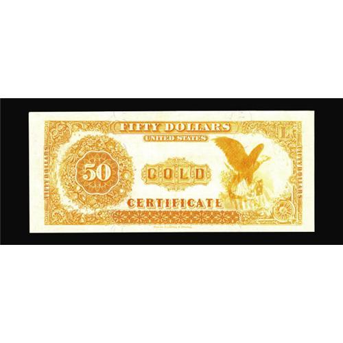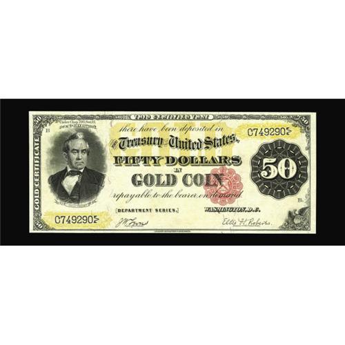<B>Fr. 1193 $50 1882 Choice About New.</B></I> Though a total of six uncirculated examples of this issue are reported extant, only two are available to collectors; three reside in institutional collections and one has never been offered for sale. This piece then competes for third in the condition-census of notes available to collectors. The lone fold that accounts for the grade falls in the most ideal place possible, between the portrait of Silas Wright and the detailed text to the right. The printing is unaffected, creating the full appearance of an uncirculated note. Front to back centering is made even more pleasing with broad margins. Overall the colors are as bold as they were the day the note was printed.<BR><I>From The Plymouth Rock Collection</B></I>
