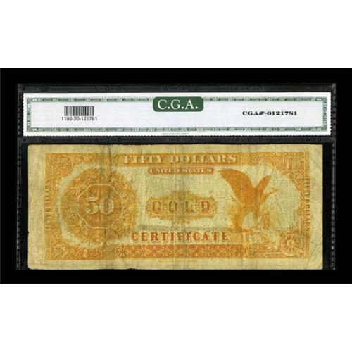 <B>Fr. 1193 $50 1882 Gold Certificate CGA Very Fine 20.</B></I> Multiple pinholes have perforated the surfaces of this lightly handled Silas Wright $50 Gold.<BR><BR><b>Shipping:</b> Coins & Currency (<a target="_blank" href="http://www.heritageauctions.com/common/shipping.php">view shipping information</a>)