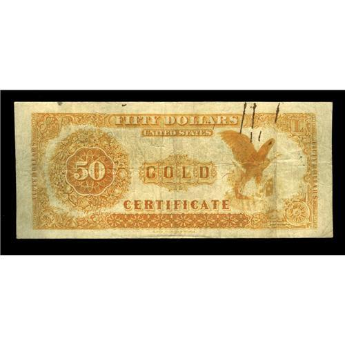 <B>Fr. 1193 $50 1882 Gold Certificate Fine.</B></I> There are two paper clip rust stains on both the face and back of this note, which is otherwise ideal for the grade. The population of this number in all conditions combined stands at about 90 pieces.