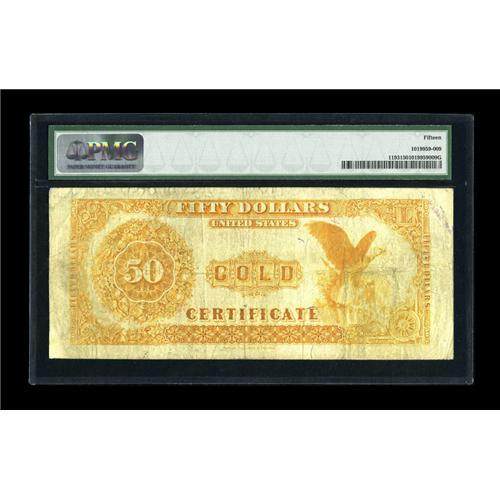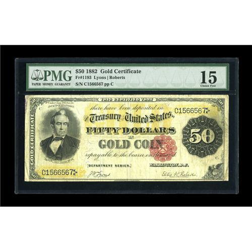 <B>Fr. 1193 $50 1882 Gold Certificate PMG Choice Fine 15.</B></I> An unmolested, strictly original example that is perfect for the grade. The margins are broad, the colors bright, and the note is completely free of the defects normally associated with this grade and denomination.<BR><BR><b>Shipping:</b> Coins & Currency (<a target="_blank" href="http://www.heritageauctions.com/common/shipping.php">view shipping information</a>)