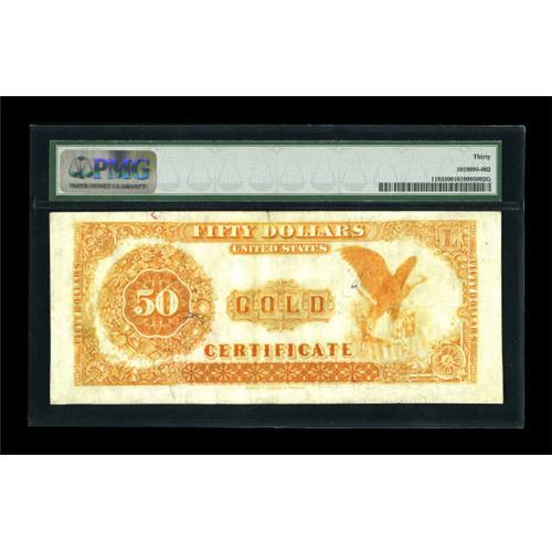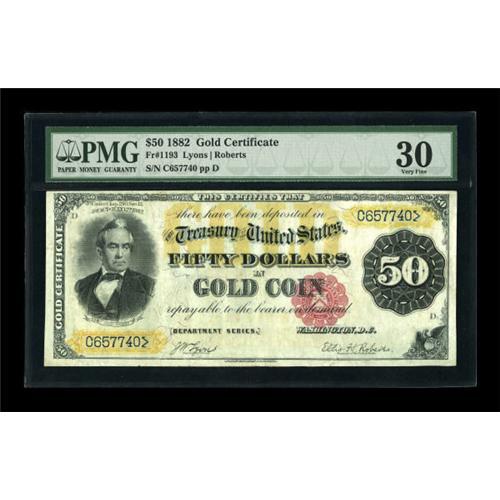 <B>Fr. 1193 $50 1882 Gold Certificate PMG Very Fine 30.</B></I> A colorful, unmolested note that is strictly original. Less than 100 examples are known in all grades with this attractive Wright $50 Gold a welcome addition to that total.<BR><BR><b>Shipping:</b> Coins & Currency (<a target="_blank" href="http://www.heritageauctions.com/common/shipping.php">view shipping information</a>)