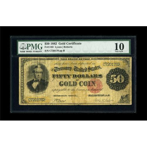 <B>Fr. 1193 $50 1882 Gold Certificate PMG Very Good 10.</B></I> Less than 100 examples are known for this elusive and desirable type.<BR><BR><b>Shipping:</b> Coins & Currency (<a target="_blank" href="http://www.heritageauctions.com/common/shipping.php">view shipping information</a>)