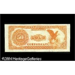 Fr. 1197 $50 1882 Gold Certificate Choice About New. Th <B>Fr. 1197 $50 1882 Gold Certificate Choice About New.</B></I> This well margined, absolutely gorgeous early Fifty is perfectly natural and is kept from Superb Gem New by the lightest of center bends. It has the full appearance of a Superb note when viewed from either side, and the nominal fold is only visible when the note is held at an angle to the light. This is the type of About New note that is quite likely to push way past the normally accepted value for the grade. Although this note is not uncirculated, it still is comfortably in the top ten known pieces among the census of 125-plus. <BR><BR><B>Important notice:</B> Heritage usually auctions material at the rate of 200-250 lots per hour. On some occasions eBay Live bid software or the Internet may not be able to keep up with the pace of the auction. We recommend placing a realistic absentee bid now as insurance to avoid disappointment. Occasionally the auctioneer may eliminate or reject an eBay Live bid, and the auctioneer may also reopen a lot after the close of the eBay live bidding (usually because we missed an audience bid), and may reject your bid even if it shows you as the winning bidder. By bidding via eBay Live, you agree that Heritage may award the lot to another bidder at its sole discretion under the circumstances described above or any other reasonable circumstances. Since eBay bids are not shown to us until we open the lot on the floor, we treat those bids just like floor bids. In most cases the floor responds before the eBay bid is presented to us, due to Internet lag time, so for consistency we have made it a policy that floor bids are always considered first over tie eBay live bids. Also please note that all Heritage lots purchased through eBay Live carry a 20% Buyer's Premium. Please make sure you read the Terms and Conditions before you bid. This lot is being auctioned in conjunction with a live floor auction by Heritage Galleries & Auctioneers. All final auction and invoice information will be supplied by Heritage Galleries & Auctioneers, and all other information should be considered preliminary. Lot:17855