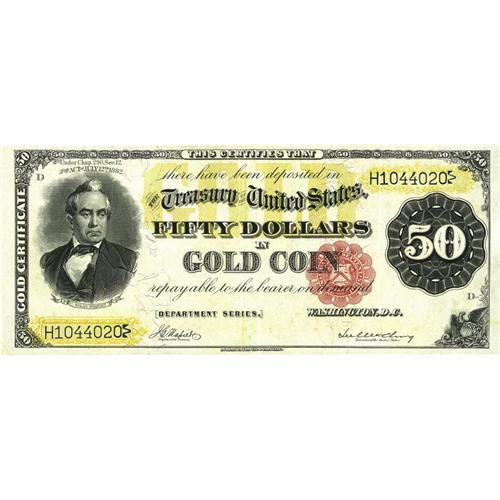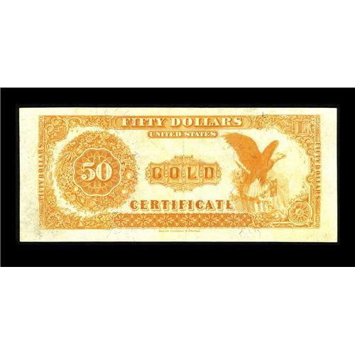 <B>Fr. 1197 $50 1882 Gold Certificate Extremely Fine.</B></I> The yellow-gold, blue, and red printings remain fully vibrant. Fully margined, and set on uncompromised paper. Unfortunately, this was the last issue to feature the ornate back design including an eagle. The back designs on the Series 1913 and 1922 notes are a bit more bland artistically speaking.<BR><I>From The Plymouth Rock Collection</B></I>
