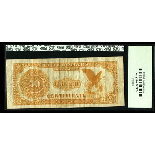 <B>Fr. 1197 $50 1882 Gold Certificate PCGS Very Fine 20PPQ.</B></I> This is another wholly original note that came to us from a hoard of notes pulled directly from circulation. Solid paper is paired with full margins, and exceptional color for the grade.