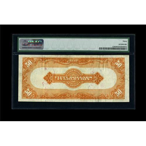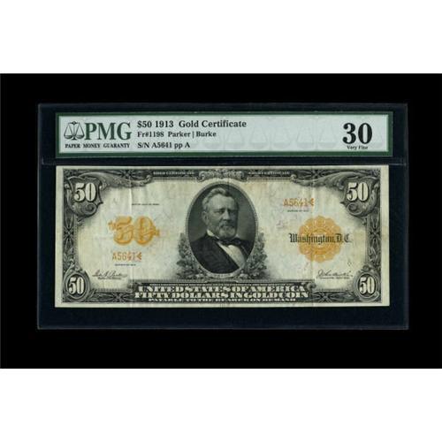 <B>Fr. 1198 $50 1913 Gold Certificate PMG Very Fine 30.</B></I> A neat four digit serial number is noticed on this strongly inked note.<BR><BR><b>Shipping:</b> Coins & Currency (<a target="_blank" href="http://www.heritageauctions.com/common/shipping.php">view shipping information</a>)