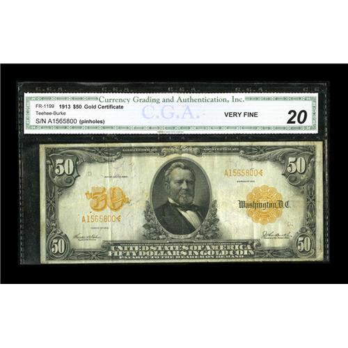 <B>Fr. 1199 $50 1913 Gold Certificate CGA Very Fine 20.</B></I> This example has been noted as having pinholes, but the paper quality looks good enough for the grade.