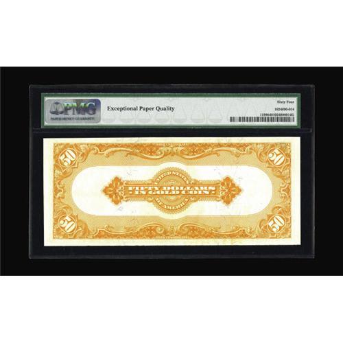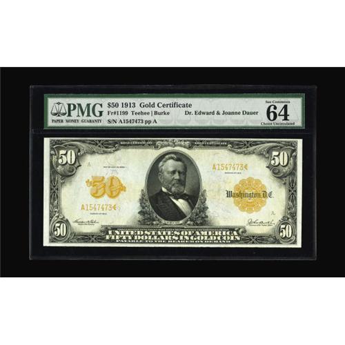 <B>Fr. 1199 $50 1913 Gold Certificate PMG Choice Uncirculated 64 EPQ.</B></I> This 1913 Fifty Dollar Gold has received the coveted "Exceptional Paper Quality," designation from PMG. The note is photographed, both sides, on page 342 of the Dauers' massive 2003 work American History as Seen Through Currency. This 1913 Series was the first Fifty Dollar Bill to carry the portrait of U.S. Grant, a portrait that, with only minor changes, is still in use on today's fifty-dollar bill. Although over 130 examples of this Friedberg number are known, fewer than 10% of them are listed as fully uncirculated pieces. This note is new to the census, and it falls right between two other uncirculated examples, one of which we sold in May of 1999 for over $8000. This note, with its brilliant colors, obvious paper originality and the PMG 64 EPQ grade, should far eclipse that number.<BR><I>From The Dr. Edward and Joanne Dauer Collection</B></I>