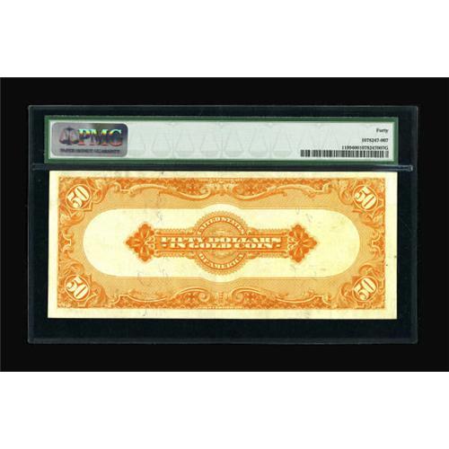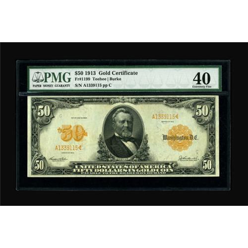 <B>Fr. 1199 $50 1913 Gold Certificate PMG Extremely Fine 40.</B></I> Solid margins and fully intact paper complement the fully bright overprint. The back design is still bold.<B><BR></B></I><I>From The John Ameen Collection</B></I><BR><BR><b>Shipping:</b> Coins & Currency (<a target="_blank" href="http://www.heritageauctions.com/common/shipping.php">view shipping information</a>)