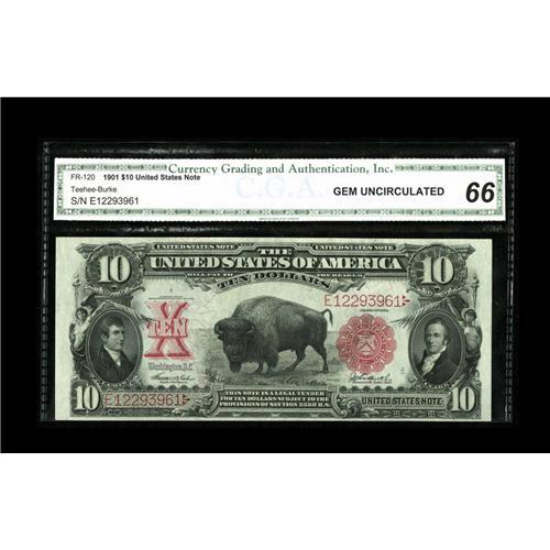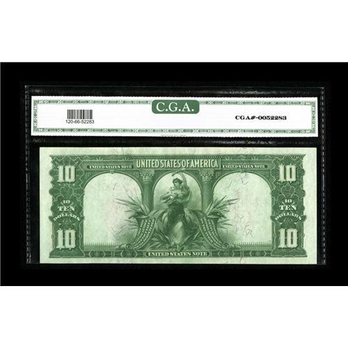 <B>Fr. 120 $10 1901 Legal Tender CGA Gem Uncirculated 66.</B></I> A bright, gorgeous note with a bold red overprint and stark black face printing on blast white paper. The back centering is ideal and the overall visual affect of the note is stunning.<BR><BR><b>Shipping:</b> Coin/Currency (<a target="_blank" href="http://www.heritageauctions.com/common/shipping.php">view shipping information</a>)