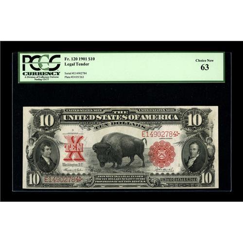 <B>Fr. 120 $10 1901 Legal Tender PCGS Choice New 63.</B></I> Lots of fresh, original color is the first thing to be noticed on this eye-appealing Bison.<BR><BR><b>Shipping:</b> Coin/Currency (<a target="_blank" href="http://www.heritageauctions.com/common/shipping.php">view shipping information</a>)