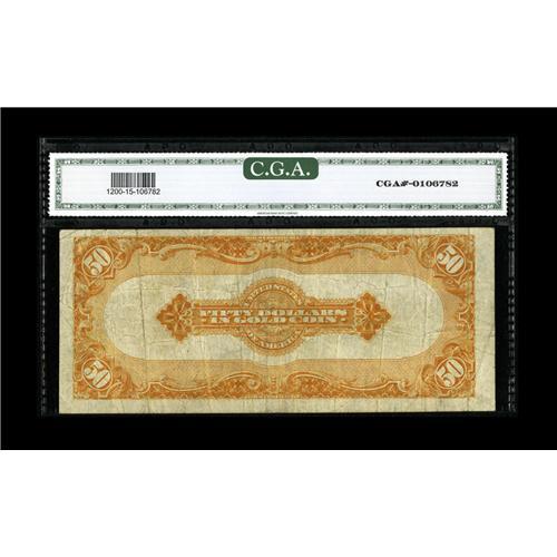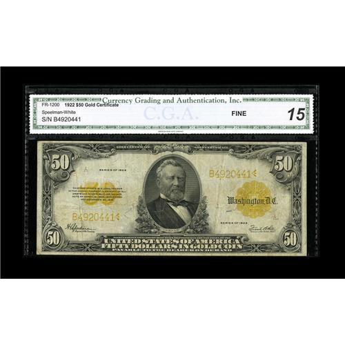 <B>Fr. 1200 $50 1922 Gold Certificate CGA Fine 15.</B></I> A certified circulated $50 Gold Certificate free from any problems inconsistent with the assigned grade.<BR><BR><b>Shipping:</b> Coin/Currency (<a target="_blank" href="http://www.heritageauctions.com/common/shipping.php">view shipping information</a>)