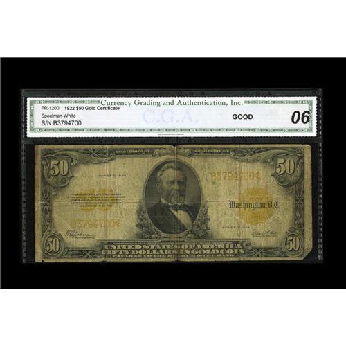 Fr. 1200 $50 1922 Gold Certificate CGA Good 6. Breaks a Fr. 1200 $50 1922 Gold Certificate CGA Good