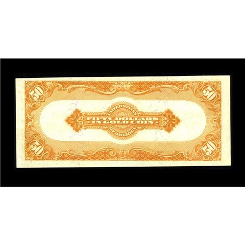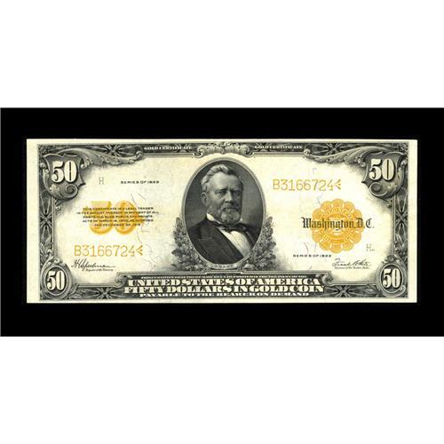 <B>Fr. 1200 $50 1922 Gold Certificate Extremely Fine-About New.</B></I> This note appears fully New, though three folds account for the grade. Overall, the eye appeal is above average and the colors are bright.<BR><I>From The Bill and Kathy Stella Currency Collection</B></I><BR><BR><b>Shipping:</b> Coin/Currency (<a target="_blank" href="http://www.heritageauctions.com/common/shipping.php">view shipping information</a>)