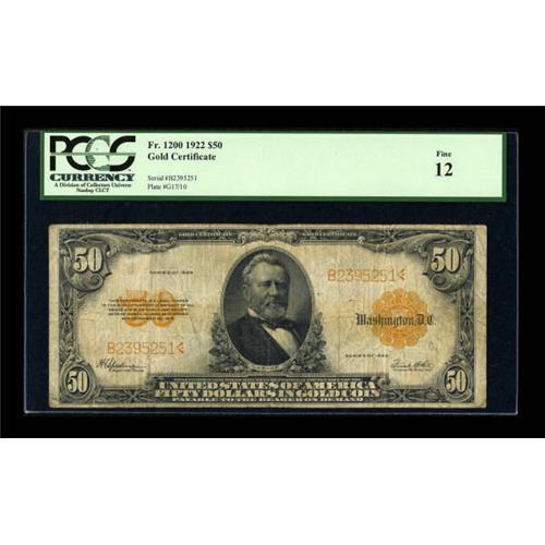 <B>Fr. 1200 $50 1922 Gold Certificate PCGS Fine 12.</B></I> A nice example of the grade with no problems worthy of mention.<BR><BR><b>Shipping:</b> Coins & Currency (<a target="_blank" href="http://www.heritageauctions.com/common/shipping.php">view shipping information</a>)