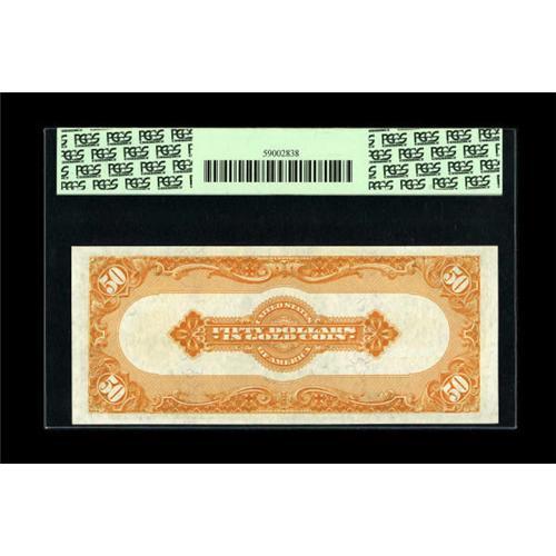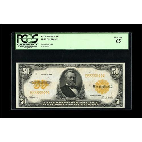 <B>Fr. 1200 $50 1922 Gold Certificate PCGS Gem New 65.</B></I> While the PCGS population data is not yet available, we can extrapolate relative grade rarity from the available PMG data. PMG has already graded 129 Friedberg 1200s. Just three have graded Gem Uncirculated 65, with another three at the 66 level and one at the 67 plateau. This example displays good margins along with rich colors and bold detail, all of which combine to produce far better than average eye appeal. Expect some serious competition to take this beauty home tonight.<BR><BR><b>Shipping:</b> Coins & Currency (<a target="_blank" href="http://www.heritageauctions.com/common/shipping.php">view shipping information</a>)